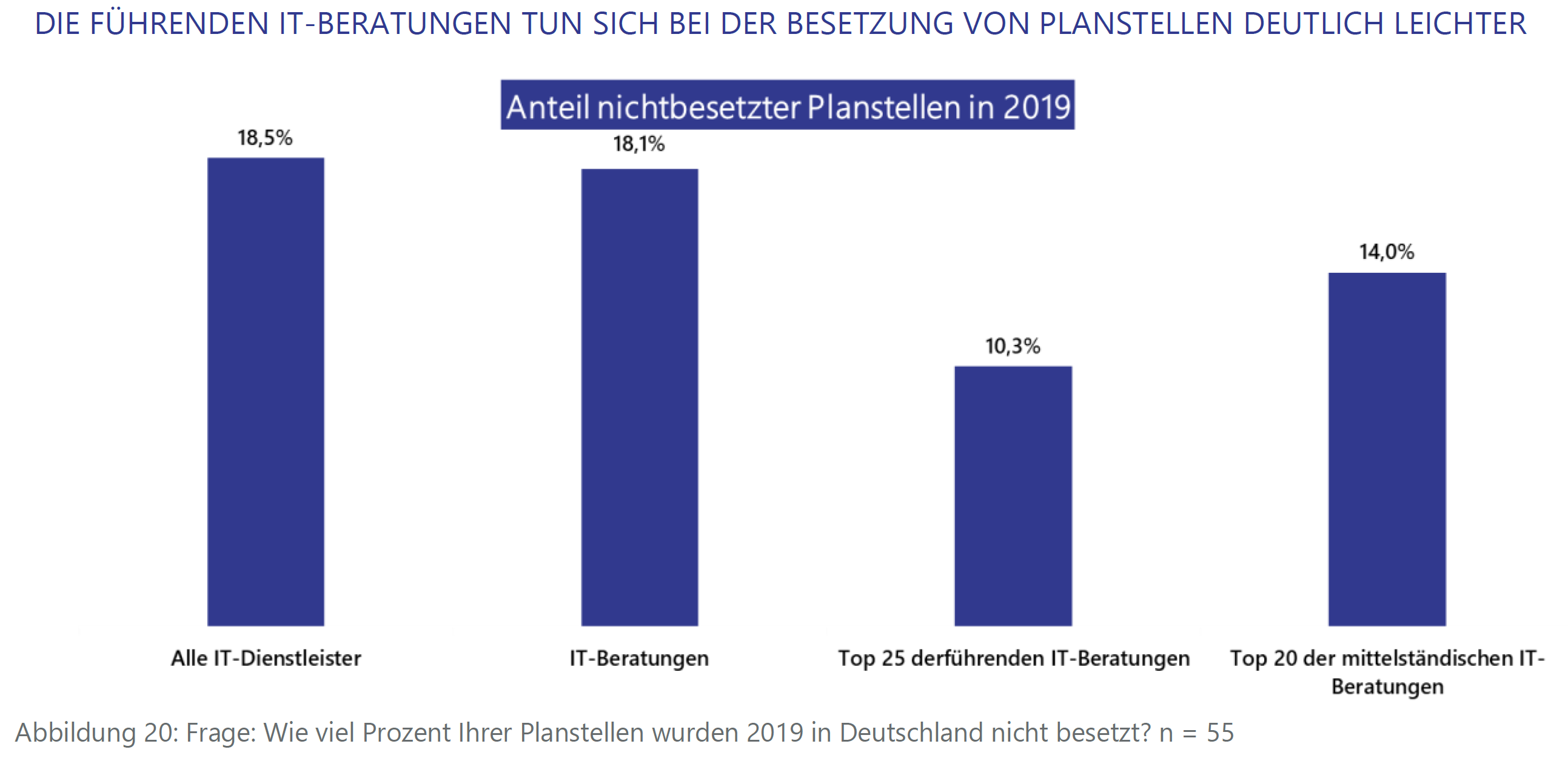 Seit vielen Jahren ist klar: Nur mit dem nötigen Fachpersonal lässt sich die Nachfrage nach IT-Dienstleistungen langfristig decken. Deshalb haben die betroffenen Unternehmen die Mitarbeiterzahl auch aufgestockt. Über alle befragten Dienstleister hinweg wuchs die Belegschaft um 6,3 Prozent. Dennoch bedeutet das nicht, dass diese Entwicklung ausreicht. Denn trotz steigender Mitarbeiterzahlen bleiben im statistischen Mittel 18,5 Prozent der ausgeschriebenen Stellen unbesetzt. Das ist unter anderem einer der Gründe dafür, dass 12,2 Prozent der Projektanfragen abgelehnt werden mussten.
