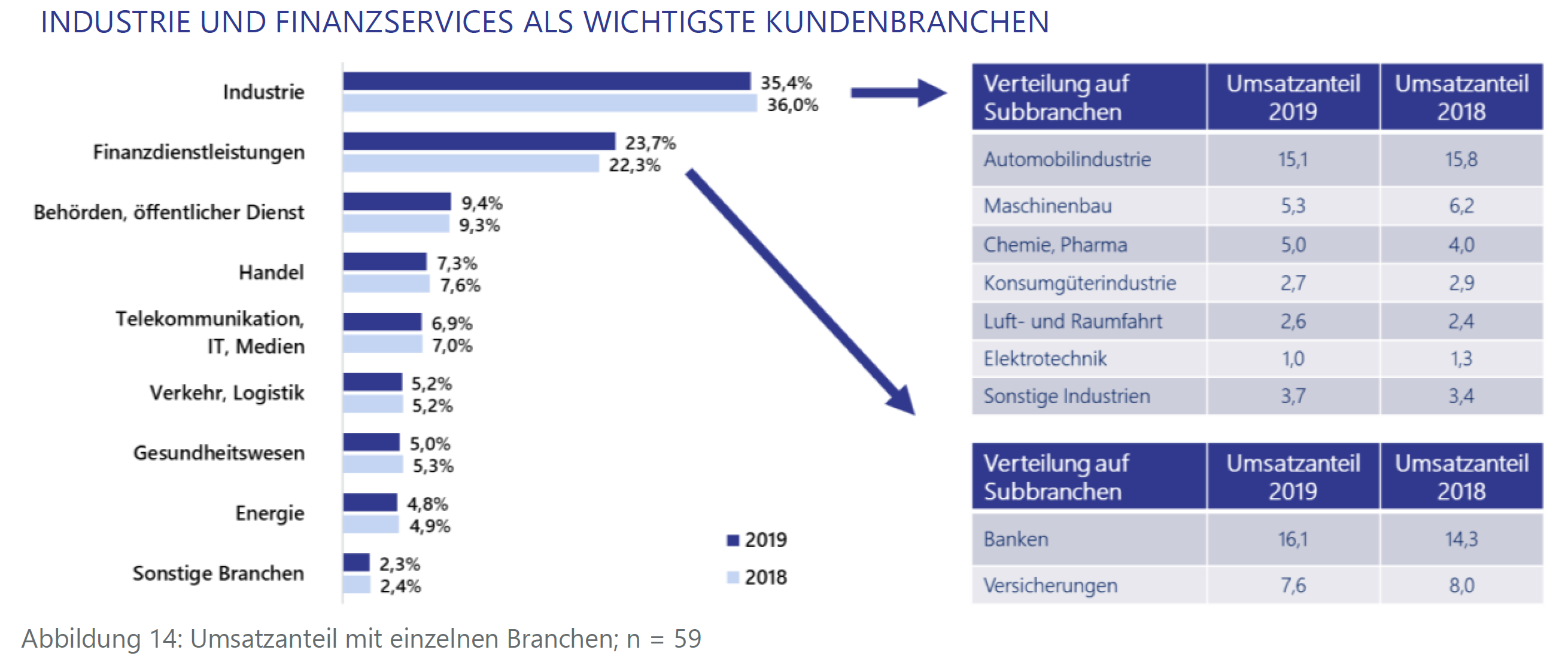 Aus welchen Branchen stammen die Kunden der IT-Beratungsunternehmen? Die Studienergebnisse bestätigen die Zahlen aus dem Vorjahr: rund 35 Prozent der Kunden kommen aus dem industriellen Sektor (2018: 36 Prozent). Innerhalb des Industrie-Sektors hat der Bereich Pharma und Chemie 1 Prozent zugelegt, während zum Beispiel die Unternehmen im Anlagen- und Maschinenbau ihren Anteil verringert haben. Dass die Industrieunternehmen weiterhin so deutlich vor den Finanzdienstleistern oder den Behörden stehen, ist kein Zufall. Der Druck hin zu weiteren Digitalisierungsmaßnahmen und dadurch zu effizienteren Abläufen und niedrigeren Kosten ist gerade hier enorm.