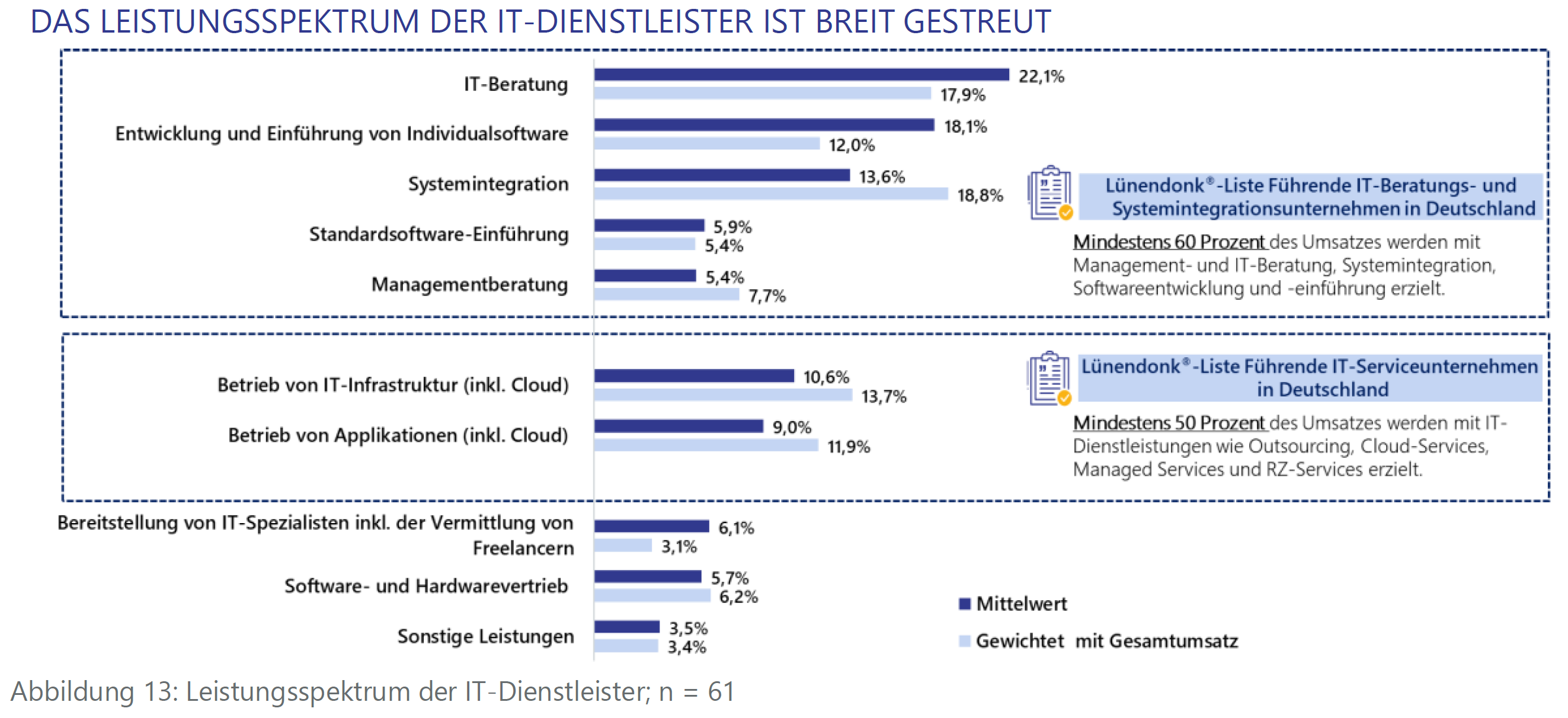 Innerhalb der Studie wurden zehn Leistungskategorien und deren Anteil am Umsatz der Unternehmen mit Schwerpunkt IT-Beratung und Systemintegration abgefragt. Wenig überraschend steht die IT-Beratung mit 22,1 Prozent im statistischen Mittel an der Spitze dieser Auswertung. Dicht dahinter befindet sich auf Platz 2 die Entwicklung und Einführung von Individualsoftware mit 18,1 Prozent. Das stellt eine Steigerung von ca. 5 Prozent im Vergleich zu den Werten von vor fünf Jahren dar. Für eine genauere Ausdifferenzierung wurde die Standardsoftware-Einführung separat abgefragt (5,9 Prozent).