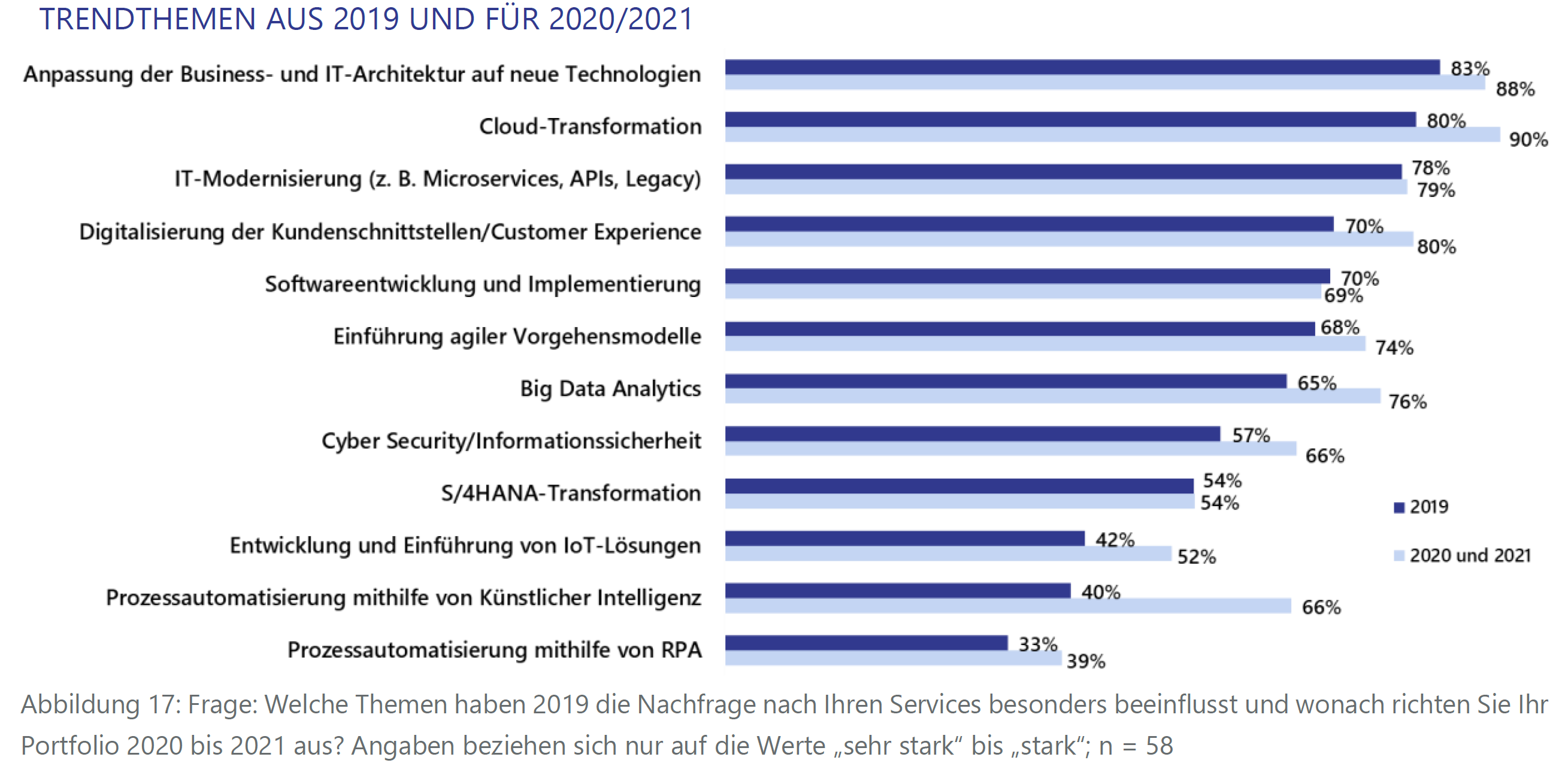 Dementsprechend wird erwartet, dass Cloud-Projekte im Jahr 2020 15,7 Prozent des Umsatzes ausmachen werden. Ähnliche Werte bezüglich der Nachfrage konnten bei der Anpassung der Business- und IT-Architektur auf neue Technologien (83 Prozent) und bei der IT-Modernisierung (78 Prozent) festgestellt werden.