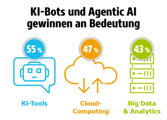 Mehr als die Hälfte der Unternehmen setzen beim Automatisieren auf KI-Tools – besonders häufig auf persönliche KI-Assistenten, Chat- oder Voicebots sowie auf KI-Agenten. Parallel zu KI kommen oft weitere Technologien wie Cloud oder Big Data & Analytics zum Einsatz.