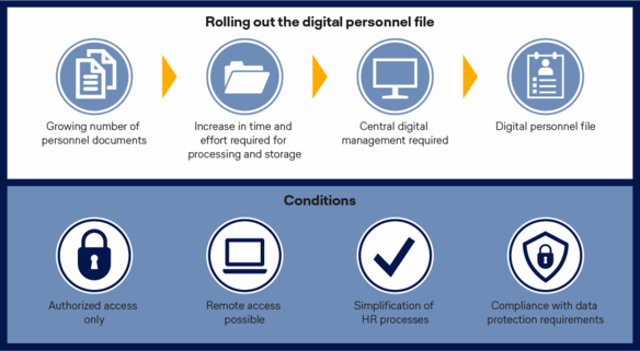 People in personnel departments still spend much of their working day on administrative tasks – or, more precisely, on searching for, finding, processing and filing paper documents. A single employee’s personnel file usually contains between 30 and 50 individual documents. In addition, IT systems in HR have often grown over time and are used without integrated solutions. For example, many companies previously only used elementary master data management in payroll accounting, or they have a varied solution environment with many different tools and processes in use, and no link or exchange between them.